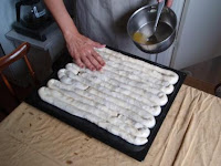 9. Adskil dem ved at skære dejen over imellem dem. Skær eventuelt enderne fra. Læg rullerne på en bradepande smurt med olie. Klat eller pensel noget af fedtstofblandingen hen over rullerne.