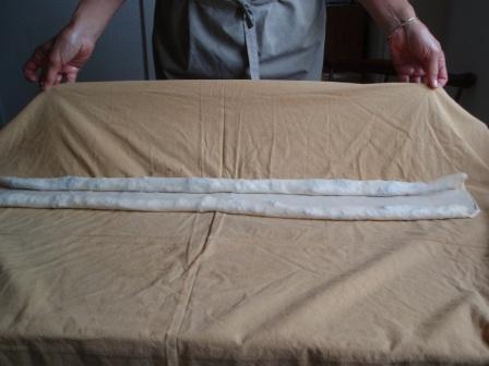 8. De 10-15 cm dej lægges over fyldet og hver side af dejen rulles ind mod midten, så du får to ca. 75 cm lange pølser. Brug evt dugen til dette (se billed). Det gør slet ikke noget hvis noget luft fanges i rullerne - tværtimod - dette vil bare gøre dem endnu mere lækre.