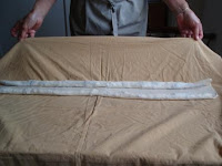 6. Læg et lille lagen over et bord og spred en stabel (altså to stykker) ud i en rektangel (ca. 75 x 100cm). Pas på med at hive for meget så der kommer huller i dejen. Hiv derfor helt ude i kanten, så denne heller ikke bliver helt tyk.